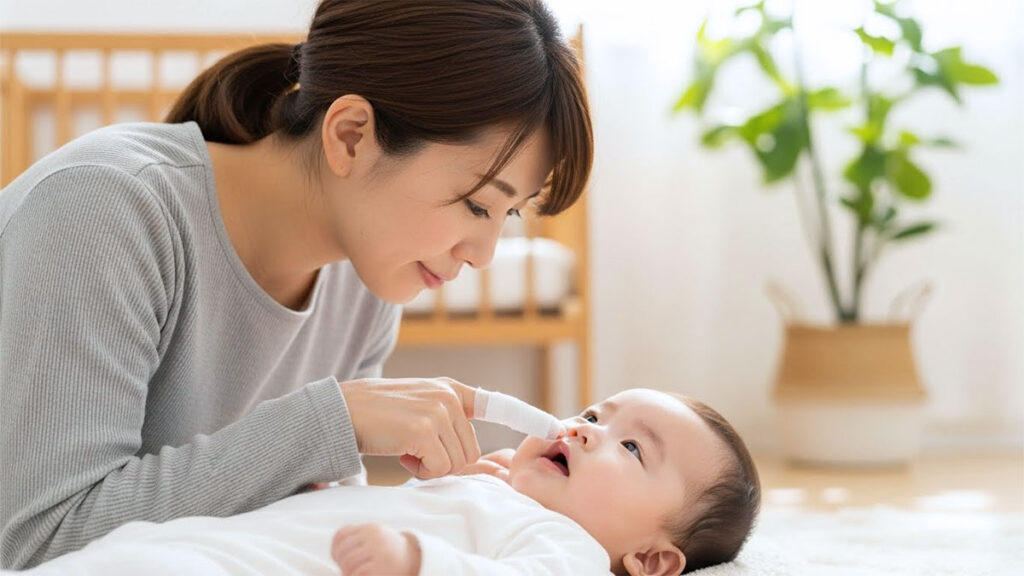 必ず手をきれいに洗ってから行いましょう。清潔な指で、まずは前歯が生えてくるあたりの歯茎をそっと撫でてみてください。「気持ちいいね」「きれいにするよ」など、優しく声をかけながら行うのがポイントです。